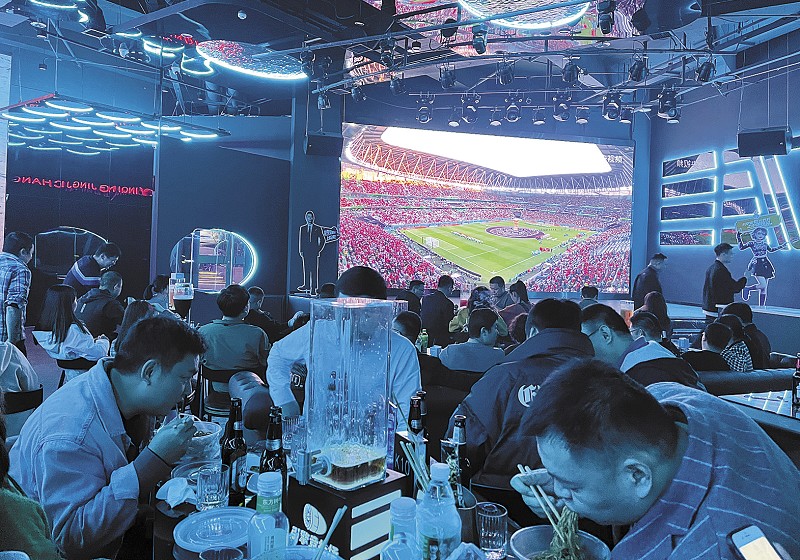 22日21时,记者在中心城区某酒馆看到,大堂挂满了入围32强球队的国旗和球衣,还搭起了三层的鸡尾酒塔和啤酒塔,氛围感十足。现场的投影大屏上正转播着赛事,酒馆工作人员身着赛服,化身足球宝贝与球迷们一同围桌而坐,呐喊狂欢。“我们推出了几款球迷福利套餐,优惠力度大,还有各种胜负竞猜活动。”现场工作人员告诉记者,世界杯期间,酒馆设有观赛区,市民到店可以喝啤酒吃烤串,一起看球聊球。店内没有强制消费,大家都能来玩。随后,记者又走访了中心城区多家烧烤店,看到不少店铺内架起了投影幕布播放比赛,客人们正在喝酒撸串看球,不时发出一阵欢呼。