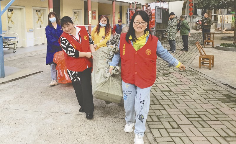 敬老院工作人员和志愿者一道搬运爱心物资。