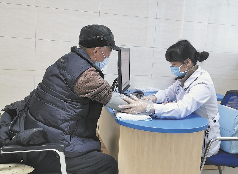 护士为前来体检的村民测量血压。