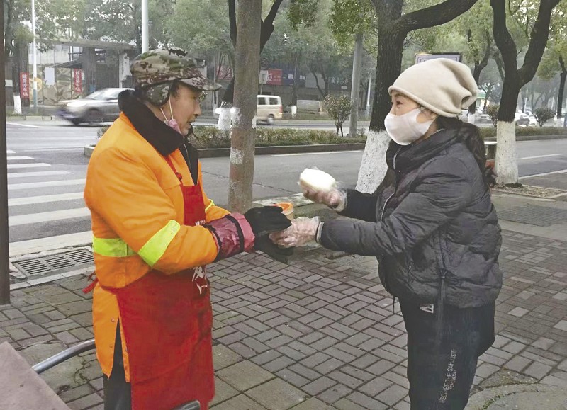 这次活动,志愿者还向坚守一线的交警、环卫工人、医务工作者、快递人员送上了香浓的腊八粥与包点。