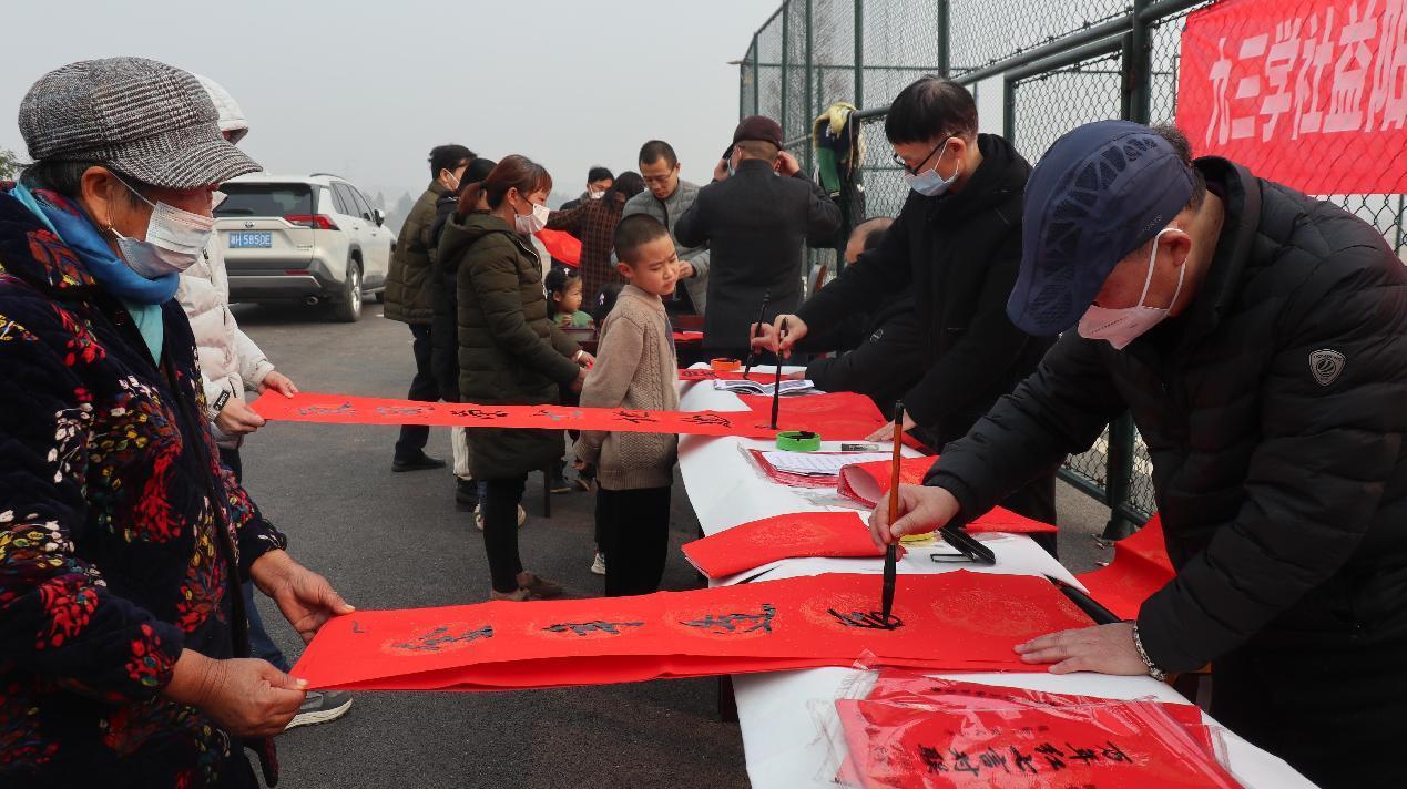“我家大门比较高,请为我写一副九字联。”“麻烦您再为我们写一副七字联。”闻讯而来的村民们一边欣赏着笔走龙蛇的书法创作,一边挑选自己喜爱的对联请书法家、书法爱好者们书写。还有家长带着自家孩子来上“书法课”:“你看看老师是怎么写‘福’字的。”