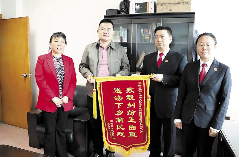 全国人大代表、安化县乐安镇青峰村党支部书记肖又香,安化县梅城镇党委负责人一行,专程前往益阳市中级人民法院,将一面印着“数载纠纷正曲直送法下乡解民愁”的锦旗送到了行政庭法官吴斌手里,感谢法官与合议庭实质性化解了一起长达20多年的邻里纠纷。