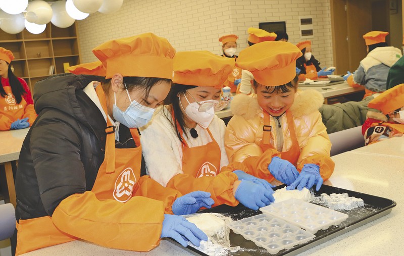 ▲ 家长与孩子一起制作元宵。胡婷摄