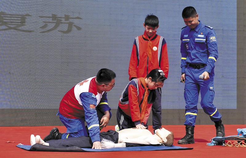 ▲救援人员教未成年人溺水救援方法。