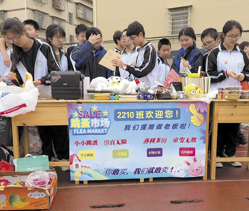 活动现场人头攒动,热闹非凡。各班同学摆摊设点,在摊位前摆好自制的促销展板、条幅、海报等,摊位上书本、玩偶、手工艺品等各类旧物琳琅满目。“老板”们热情地招揽生意,向前来挑选商品的“顾客”详细介绍与推荐,现场吆喝声、咨询声、讲价声此起彼伏,欢声笑语不断。“很热闹很好玩,但也蛮累的。”2214班学生张倩说,这次活动让她不仅学到了一些做生意的技能,也体会到赚钱的艰辛,理解了父母的不容易,很有意义。活动结束后,各班自觉清理货物、打扫垃圾,校园重新恢复安静与整洁。