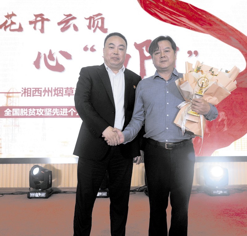 在益阳烟草系统“礼赞劳动美清廉益于心”主题活动上,益阳市烟草专卖局(公司)党组书记、局长、经理李雄伟(左)向来自湘西烟草的宣讲者、“全国脱贫攻坚先进个人”张向阳献花。