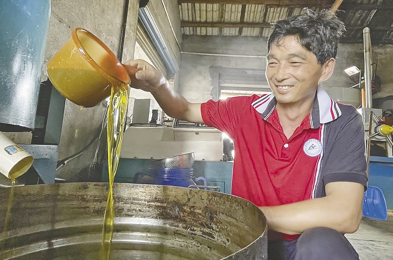 5月30日,记者在南县厂窖镇西州村党总支书记曾国辉的带领下,前往村民文波的榨油工坊,隔着数十米便闻到一股菜籽油独有的香气。走进工坊,浓郁的香气扑鼻而来,一旁榨油机器轰隆隆地作响,棕黄色的菜籽油从机器内缓缓流出,文波和妻子将其过滤后慢慢装入油瓶。曾国辉看着色泽明亮的菜籽油高兴地说:“今年咱们村集体流转的油菜地已经全部收完了,亩产120公斤左右,收成比去年好,预计能为村集体经济增收近3万元。”