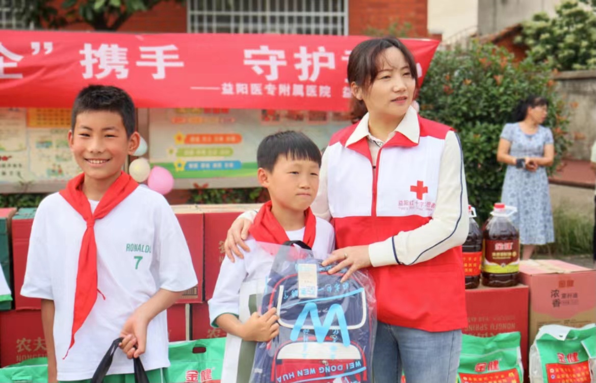 5月31日,市红十字会联合益阳医专附属医院、湖南万利达商贸有限公司,为赫山区沧水铺镇河江湾小学的孩子们送来生活物资与文具用品,送上节日的关怀。
