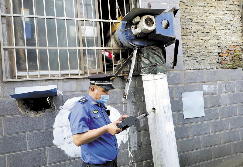 市城管执法局直属三大队执法人员对餐饮门店进行油烟排放检测。