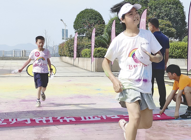 9时,随着开赛的发令哨声响起,家长带着孩子奔跑起来,享受亲子彩跑带来的欢乐。沿途每经过一个彩粉喷洒点,就会有红、黄、蓝、绿等不同色彩的粉末喷洒到身上。各色粉末在半空交汇,形成了一道美丽的彩虹。