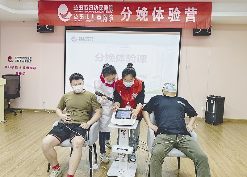分娩体验营活动中,两位准爸爸通过仪器感受分娩带来的疼痛。