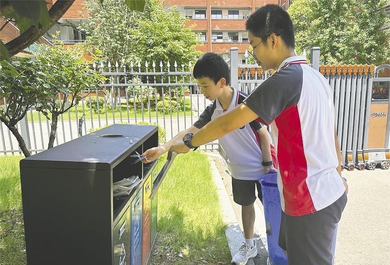 学生将垃圾分门别类投放到相应的垃圾桶中。