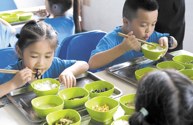 小朋友享用医院员工食堂免费午餐。