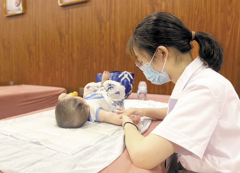 医护人员为婴幼儿做保健推拿。