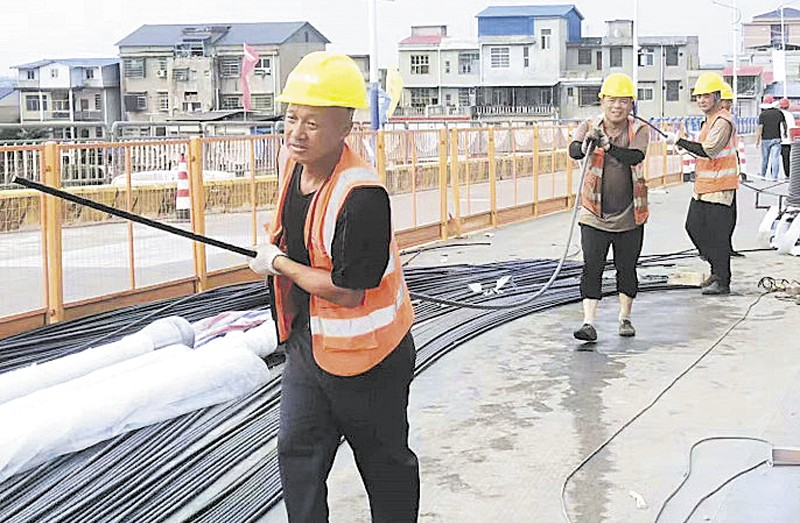 8月1日,在G234线南华大桥危旧桥改造现场,建设者们抓紧切割制作桥梁斜拉索的主要材料钢绞线,5名工人各司其职、相互协作,冒着高温,抢工期、保进度,用汗水刷新项目建设“进度条”。