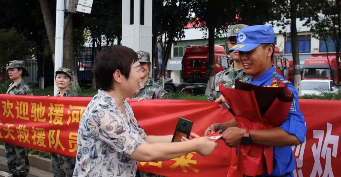 8月6日下午,市红十字会主要负责人和救援队队员们热烈欢迎驰援河北省涿州市的益阳市蓝天救援队凯旋。“抢险救援圆满完成任务,安全返回!”下车后,救援队员列队集合,市红十字会主要负责人对救援人员平安凯旋表示热烈欢迎和祝贺。市民群众夹道迎接英雄们的到来,赞扬他们是无私无畏、心怀大爱的勇士。