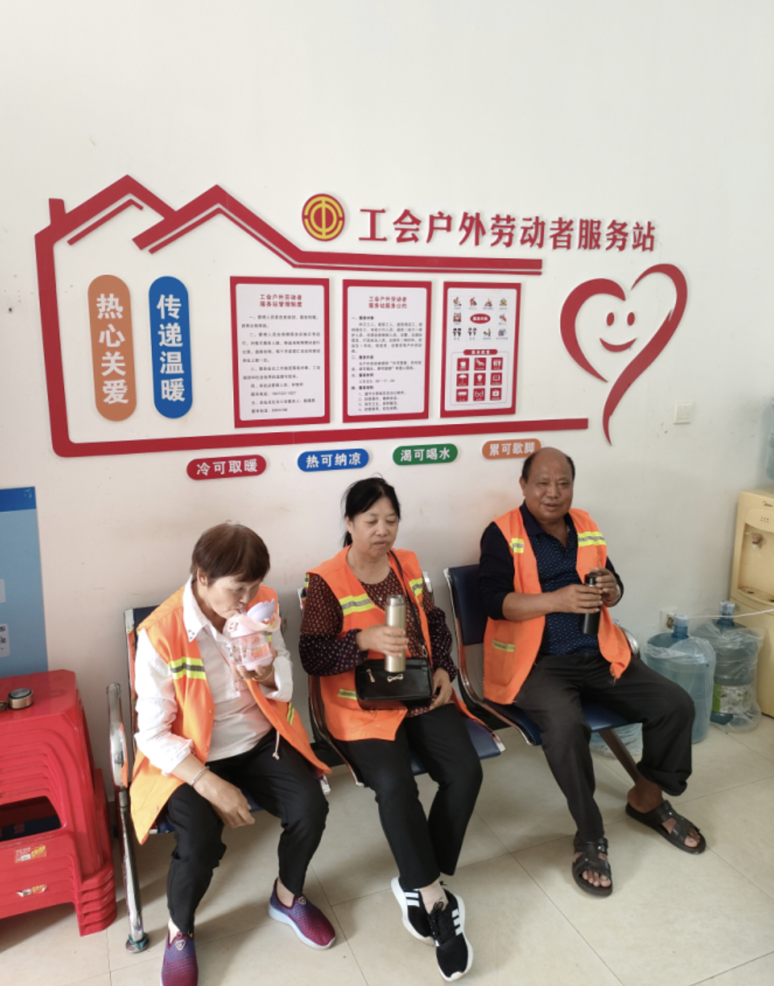 据了解,为解决广大环卫工人、园林绿化工、出租车驾驶员及其他户外劳动者在工作中面临饮水难、就餐难、休息难和如厕难等问题,市总工会按照“工会主导、社会参与、共建共享、务实高效”的工作思路,推进工会户外劳动者服务站建设。工会户外劳动者服务站每天9时至17时免费向户外劳动者开放,配备空调、饮水机、爱心雨伞、急救药箱、微波炉等,能为户外劳动者提供免费饮水、临时休息、餐食加热、手机充电、更衣如厕等服务。