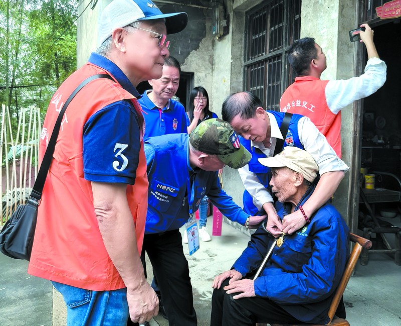 ▲ 志愿者给抗战老兵佩戴纪念章。 陈浩军摄