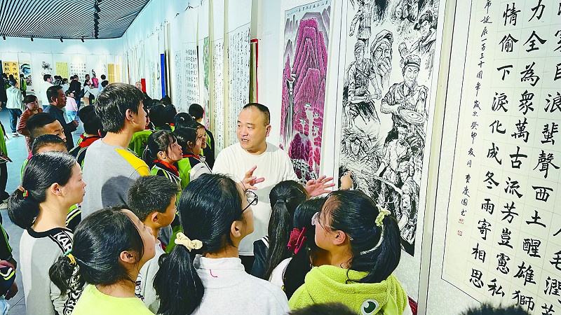 下图:学生们一边参观,一边听解说员讲述作品背后的故事。 刘行剑摄