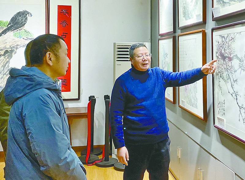 郭安邦(右)与书画院同仁讨论艺术作品。周琳摄