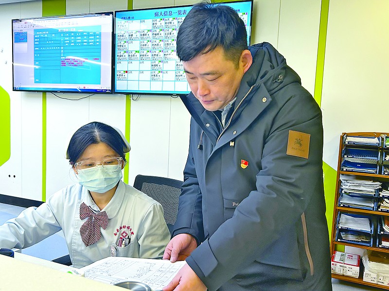 尹杰(右)日常走访、巡查医院工作情况。刘馨予摄