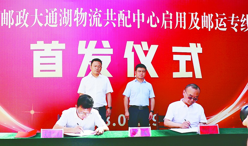 邮政大通湖物流共配中心启用及邮运专线首发仪式现场,益阳邮政分公司与大通湖区管委会签署战略合作协议。
