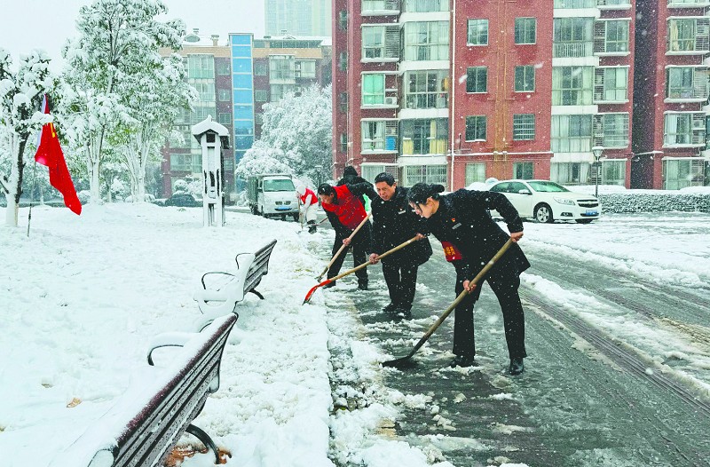 桂苑新村小区物业员工在铲雪。刘行剑摄
