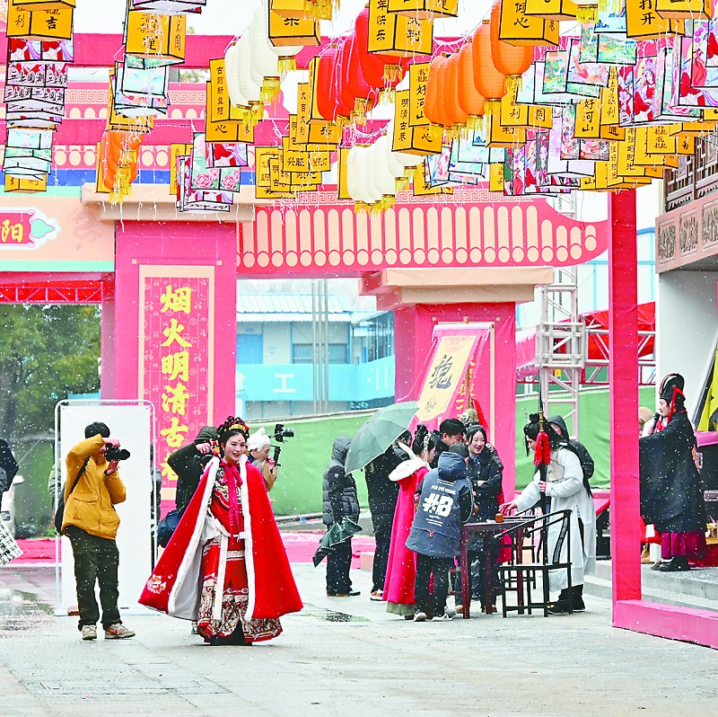 资阳区桥北大市场人头攒动,琳琅满目的商品令人眼花缭乱。近千户商家展示的糖果、水果、红灯笼和对联等年货铺满货架;展位上的吊瓜子、益阳故事酒、白糖饺子装满人们的购物袋;直播间里,主播们轮流介绍木槿花、羊肚菌等特色产品。清溪村茶子花街,中国风元素的灯笼古香古色,祈福墙引人驻足,游客们打卡、玩乐、购物,忙得不亦乐乎。