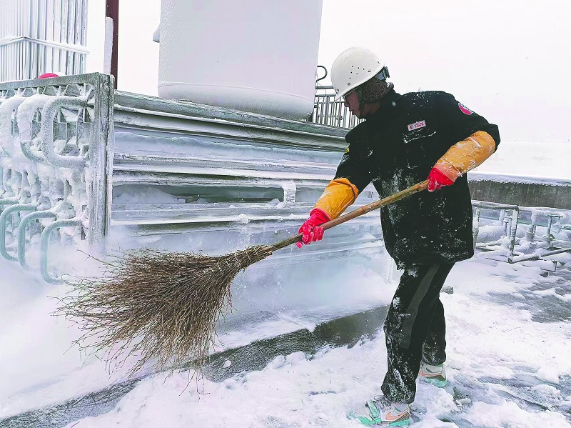 工作人员清扫门站LNG区域积雪。 曾亚美摄
