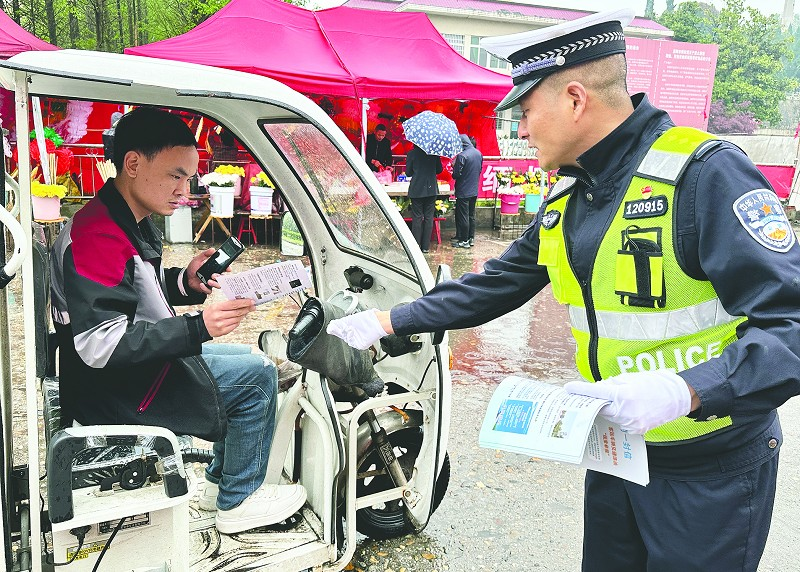 4月3日,在益阳高新区鹿角园路金山公墓,省高警局益阳支队与市公安局交警支队民警在公墓出入口疏导交通,引导车辆即停即走,不堵塞交通,雨天减速慢行。