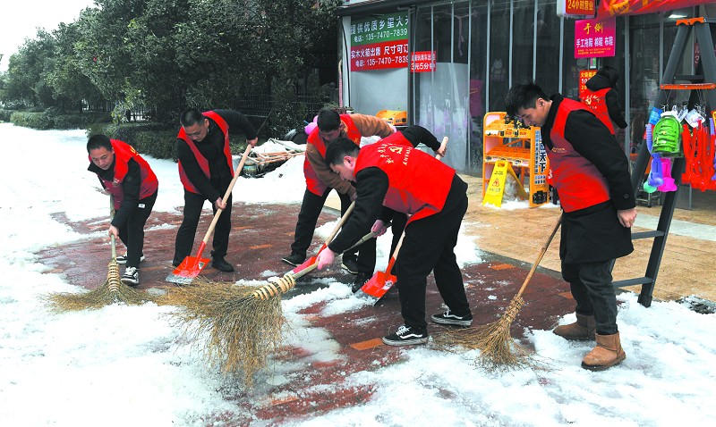 ▲该局职工在吴婵娟店门口帮忙铲雪。聂济忠摄