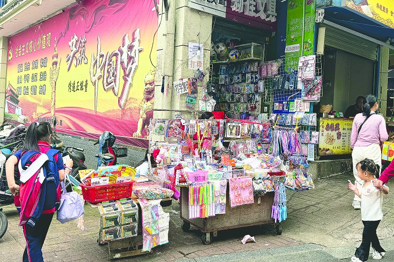 5月7日,记者在中心城区桃花仑小学周边看到,校园外的小吃店、文具店等商铺基本做到规范经营,但路边有几个售卖玩具、油炸食品的流动摊贩占道经营。一到放学,这些摊位前便挤满学生,加上大量的人流车流,导致道路拥堵,带来安全隐患。