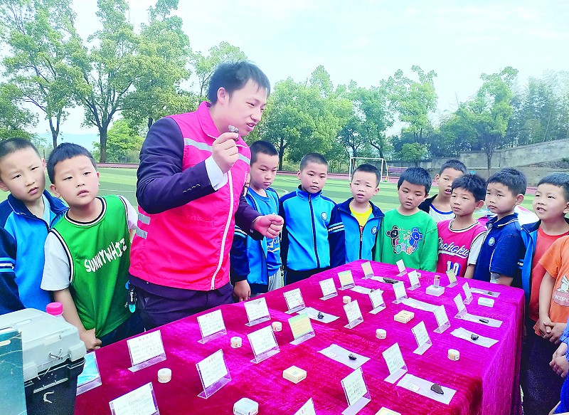大图:志愿者为小朋友讲解陨石知识。苏钢摄