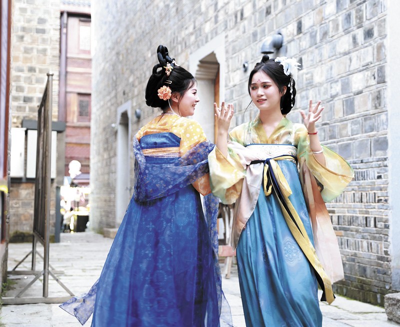 游客身穿汉服在景区小巷内游览。吴巧摄