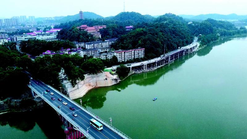 南滨江路桥毗邻会龙山大桥,西接南滨江路,东连裴公路,由中交二航局承建,是资江沿江风貌带交通网络的重要组成部分。桥梁上部结构采用整体现浇预应力混凝土箱梁结构,全桥共设五联,全长332米,标准桥面宽13米,双向两车道设计。