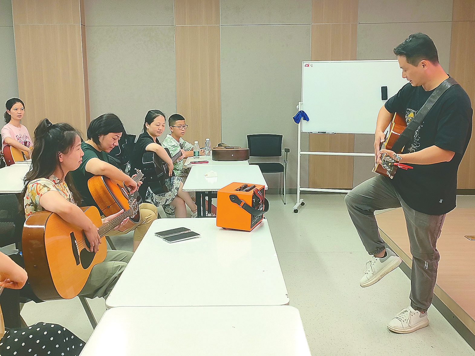 当天的培训有电吹管和吉他两门课程。电吹管班通过8节课教学使学员掌握3-5首乐曲,吉他班授课从基础指法开始直至弹唱配合。在电吹管课堂上,老师系统讲解乐理知识和演奏技巧,分解演示经典曲目《玛丽有只小羔羊》,针对学员的指法与姿势予以逐一指导。学员张琦兴奋地说:“能够免费参加电吹管培训班非常开心。我感受到了音乐的魅力,也认识了很多志同道合的朋友。”