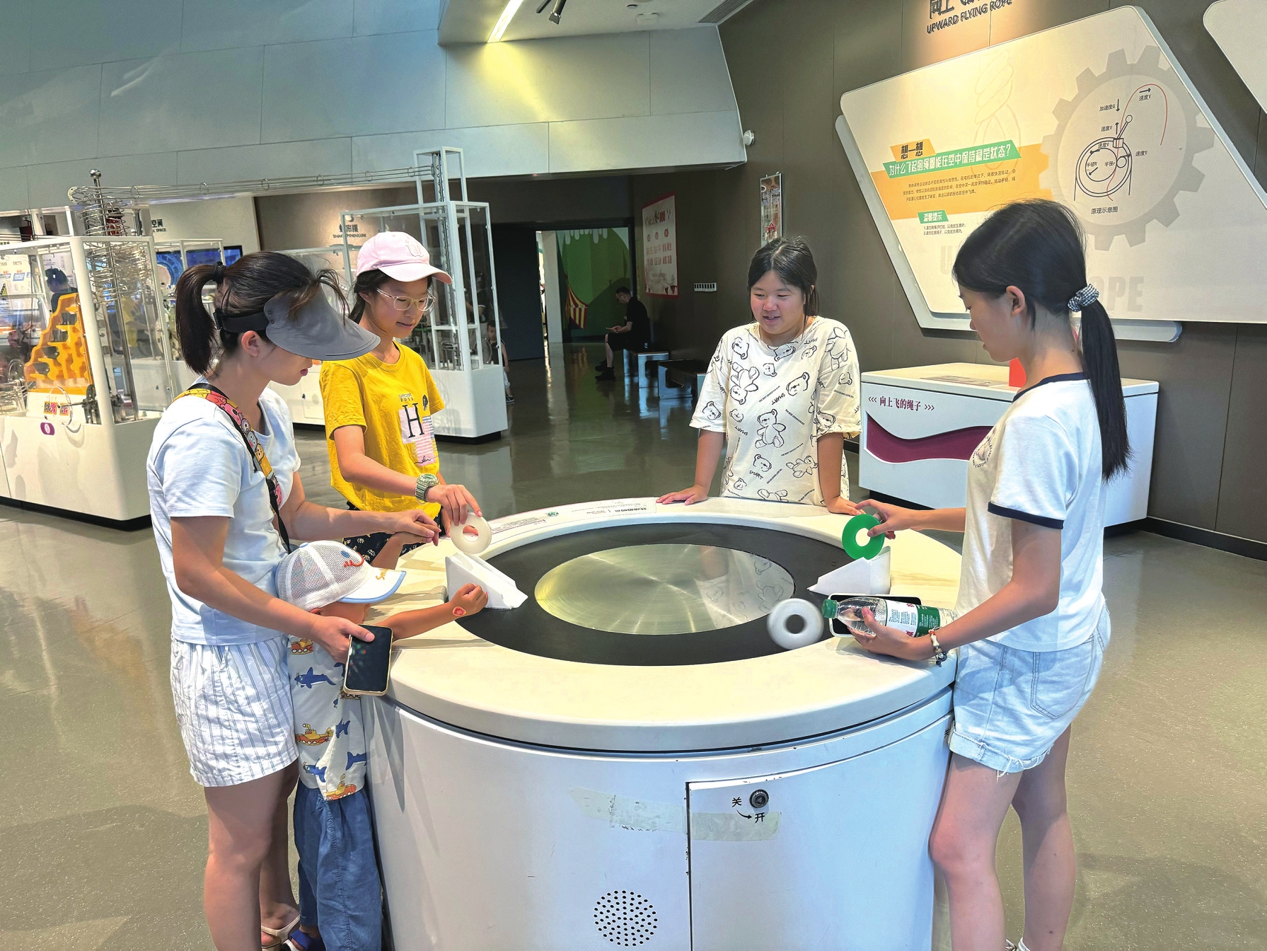 市科技馆内,市民实操科技装置“转动的圆盘”。周明瑶摄