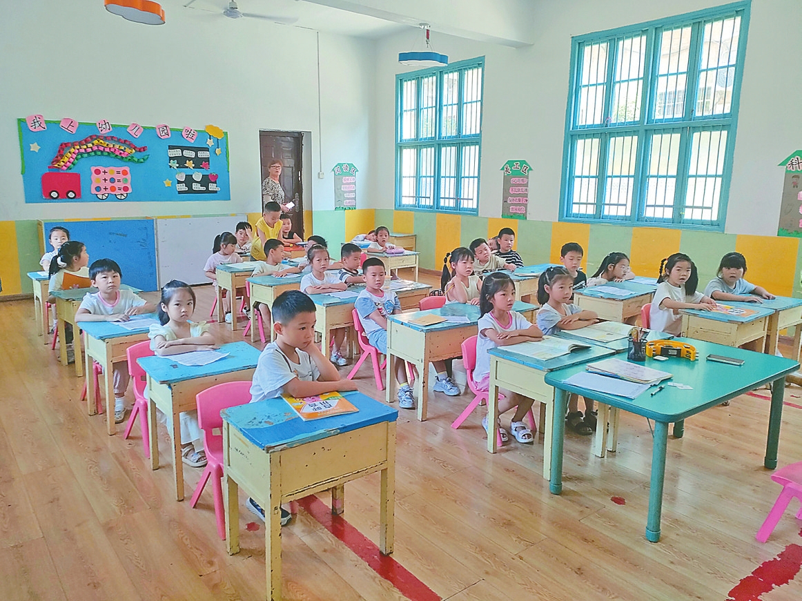 幼儿园里空荡荡的,唯独一间教室传来“h—ē—hē”的跟读声。推开这间挂着“小一班”门牌的教室,只见一名年轻女教师正在上课,20余名五六岁的孩子坐在矮桌椅上认真听讲。
