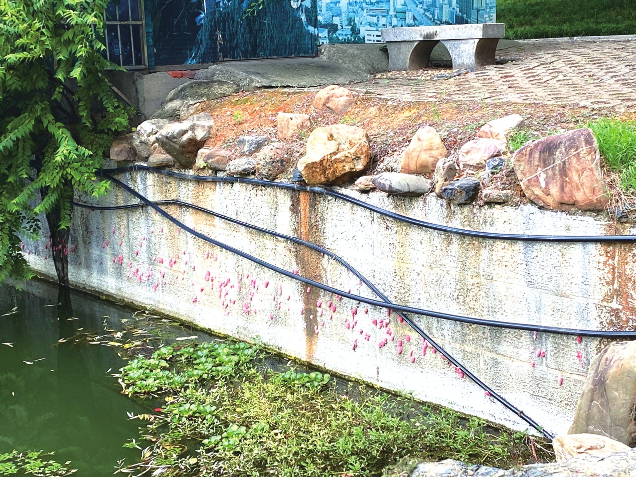 秀峰公园沿湖石壁上黏附着福寿螺粉红色的卵。周琳摄