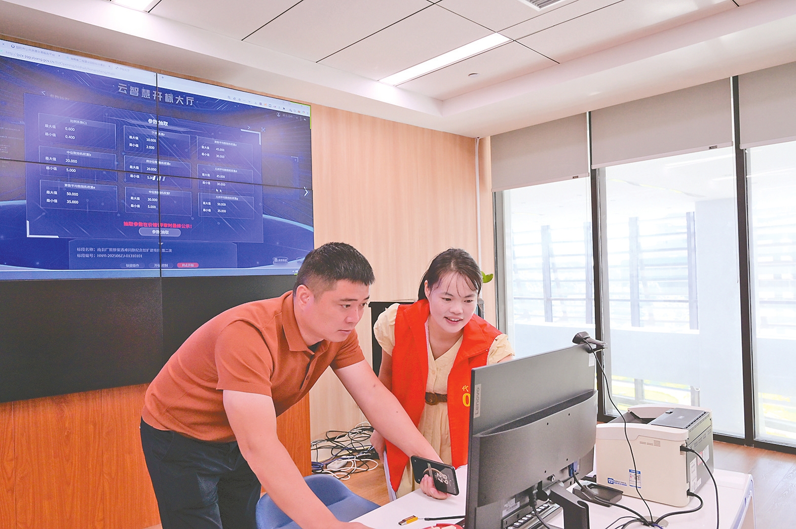 投标人钟浩(左)线上解密标书。刘美玲摄