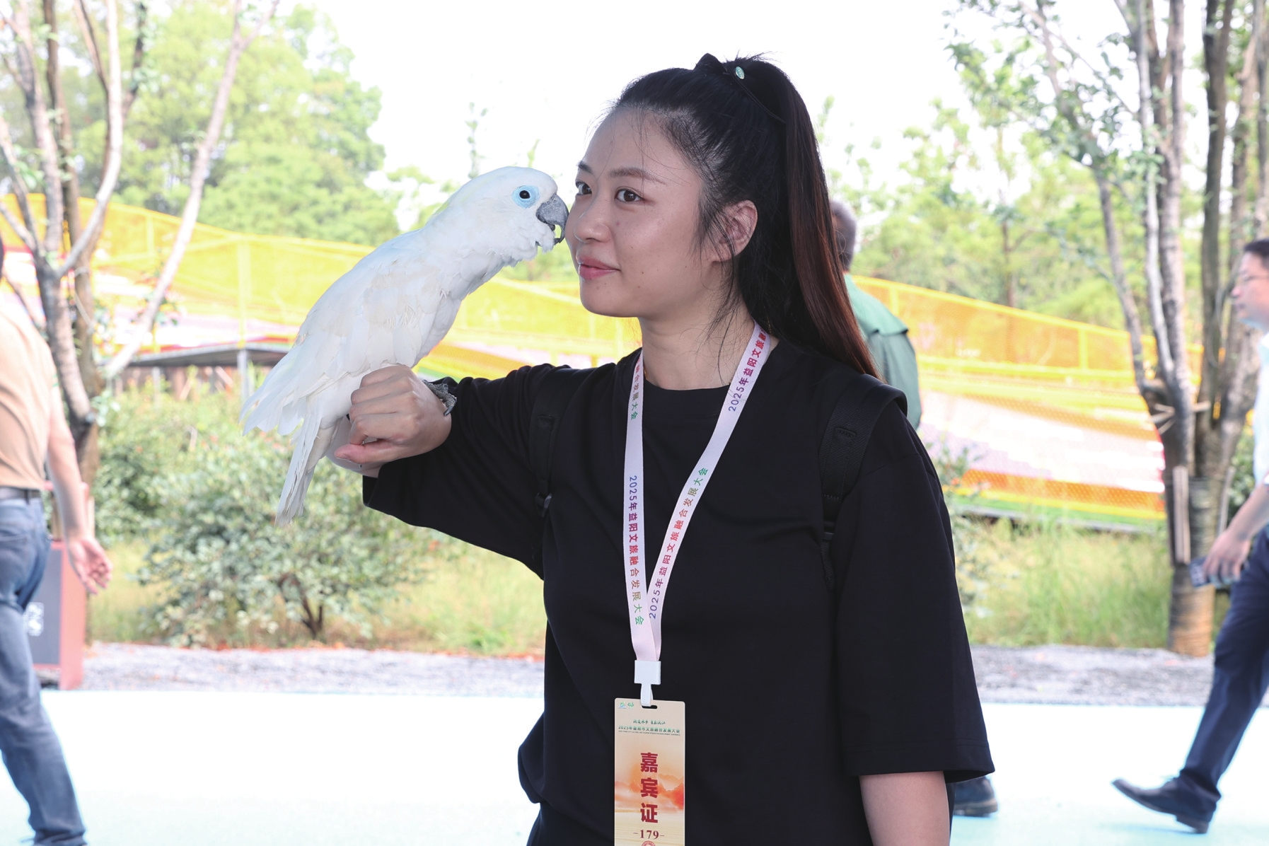 在南洞庭飞鸟乐园,游客与鹦鹉亲密互动。吴巧摄