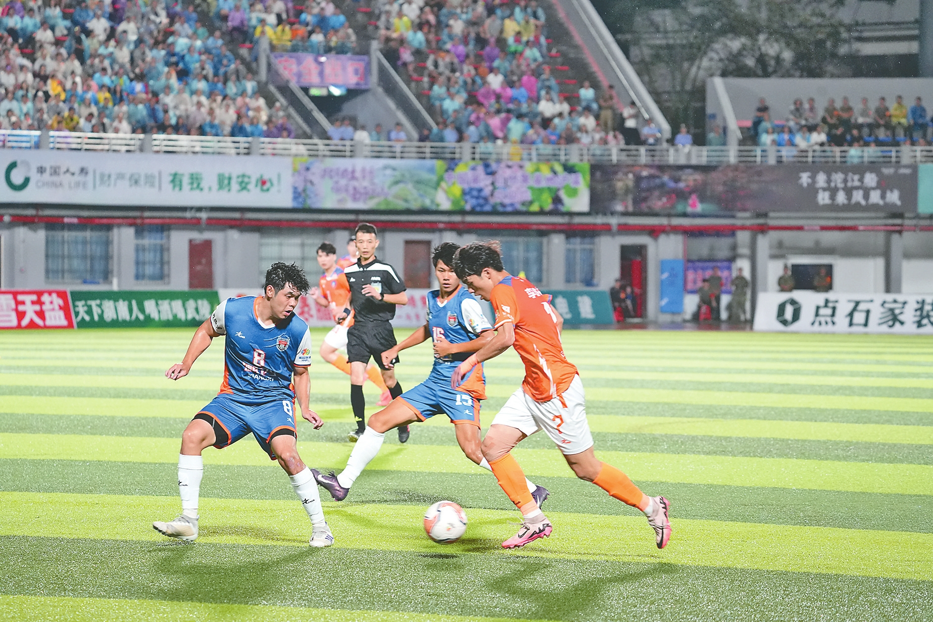 下半场,双方易边再战,比分落后的湘西队拼尽全力,无奈身体和技术都不占优,场面依然胶着。第85分钟,李灿龙将球推进前场,禁区左上角突施冷箭,足球划过一道漂亮的弧线,进入网窝,益阳2:0领先。之后双方互有攻守,均无功而返,2:0的比分保持到了终场哨响。