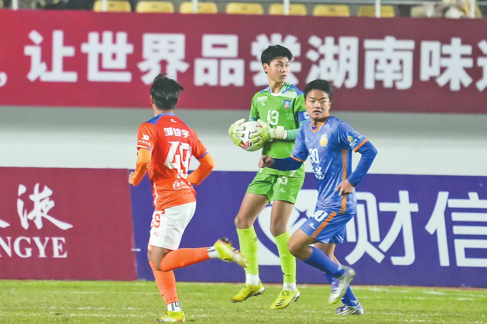 在“湘超”赛场上,王译见识到了职业球员的技战术水平。“比如岳阳队的前锋,射门速度比我平时训练遇到的快很多,角度也更刁钻。”但他并未怯场,反而在与强手的较量中快速成长。10月25日对阵岳阳队的比赛中,他连续化解7次射正,被解说员称为“移动的城墙”;9月20日客战衡阳时,更是用一次关键单刀扑救保住了球队的尊严。