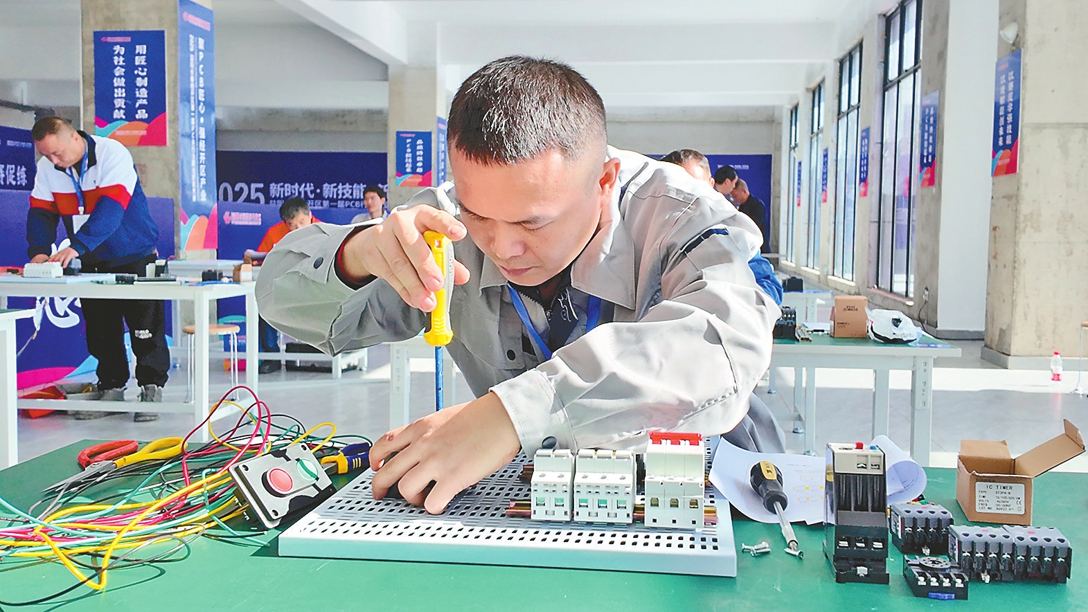 比赛现场,参赛选手们全神贯注,有的手持精密镊子快速贴合元件,有的屏息凝神校准电路板,还有的在产品装配环节上演“指尖芭蕾”。“这次比赛是真刀真枪的较量,规则严、标准高,但正是这种实战化设计,使得我们提升技能有了明确的方向。”参赛员工向伟波感慨道。