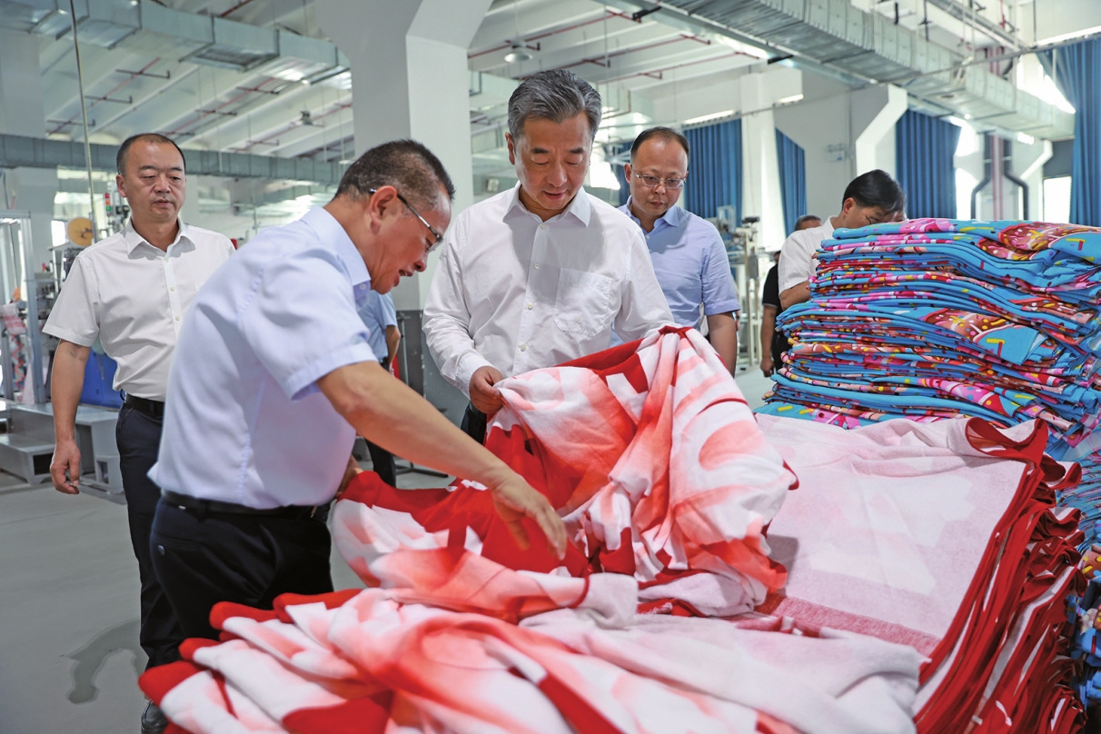 5月9日,市委书记陈竞围绕“改造提升传统产业”主题开展“十五五”规划专题调研,深入湖南吉祥家纺有限公司了解轻工纺织产业转型升级情况,并走访市人大代表、公司董事长陈建军。吴巧摄
