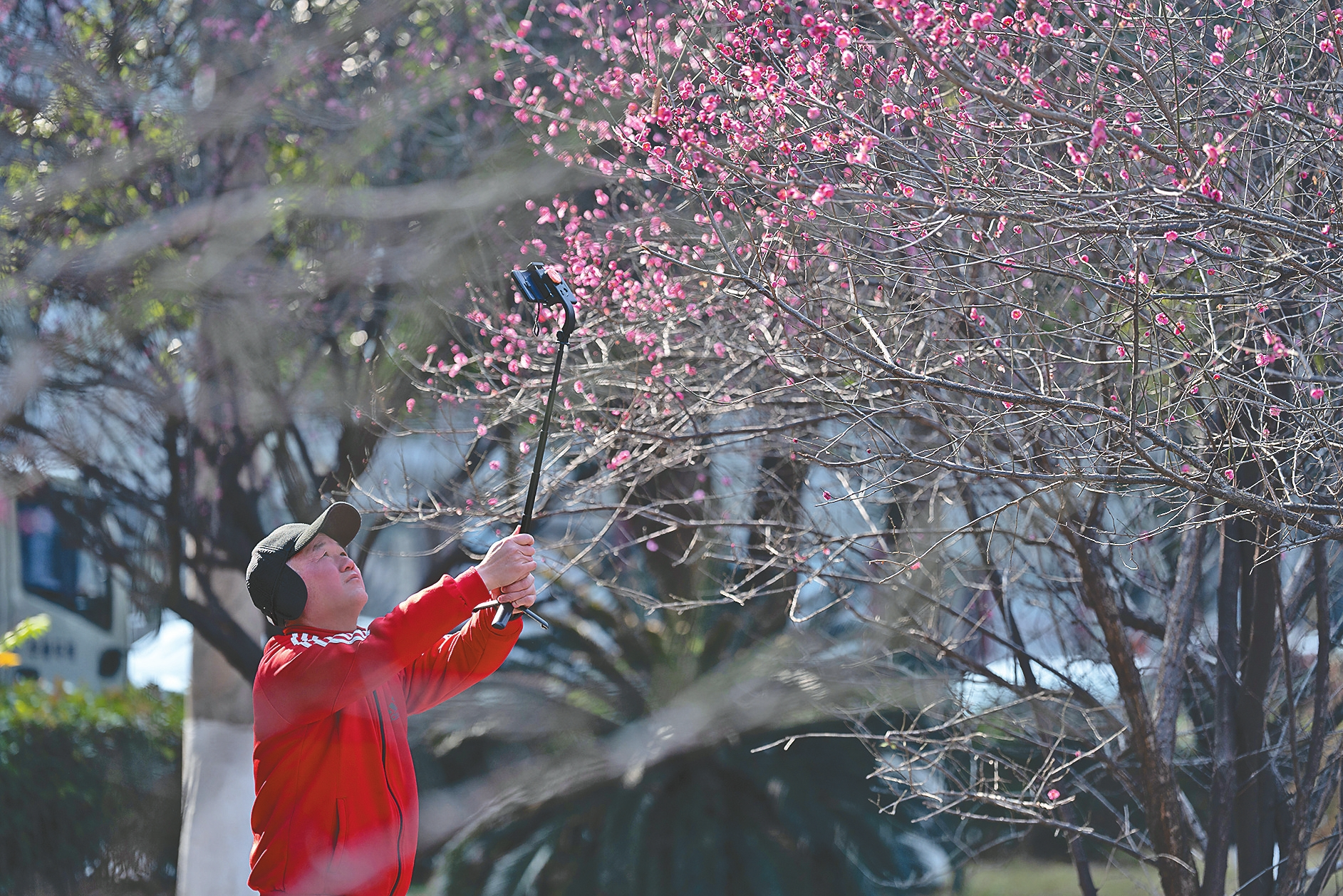 摄影爱好者在一园两中心拍摄梅花。黄云摄