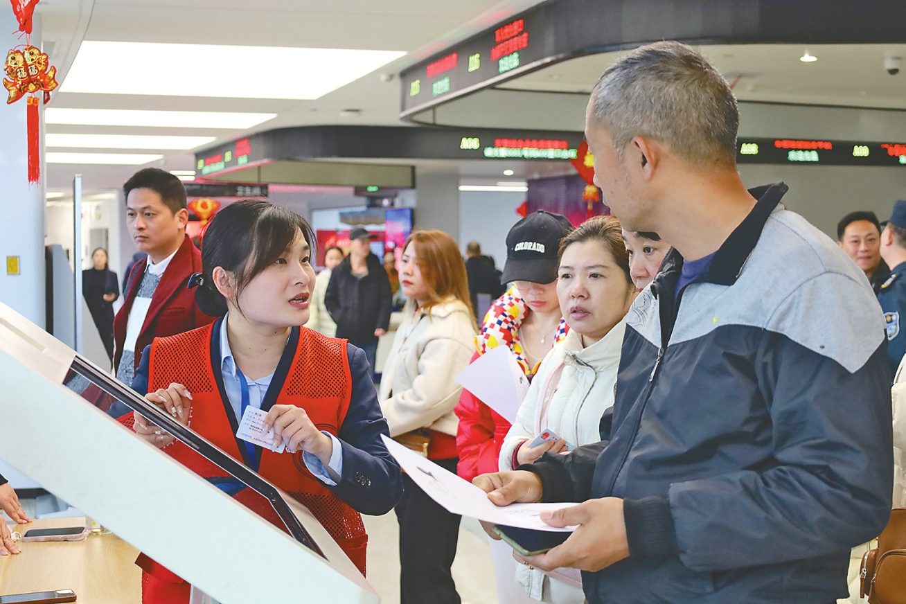 “您办什么业务?取号了吗?”导办人员徐梅蓉弯着腰,耐心询问一位正在整理资料的老人。确认老人是来领身份证后,她笑着指向身后:“身份证现在一楼就能取,不用在这儿排队,我带您下去。”老人连连道谢,跟着她往电梯口走去。