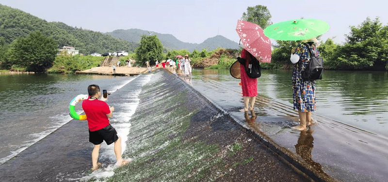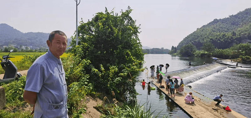 发现我们到来,一位村民拿着“跟屁虫”、游泳圈等救生设备向我们推销,还提醒我们游泳时注意安全。这位村民名叫胡学群,他告诉笔者,这个拦水坝修建于上世纪六七十年代,主要用于沾溪两岸稻田灌溉用水。由于大坝上游水深大都不超过1.5米,加上溪水干净、水流平稳,是一个天然的户外游泳池。这几年,每当夏季来临,来这里游泳的人很多。多的时候,一天有好几百人。“每天这么多人游泳,这里安全么?”笔者问。“安全。”胡学群说,“来这里游泳的都是有备而来,特别是带小孩的,大人都是牵着孩子的手,在水浅的地方游,加上这里水流很平稳,所以还是很安全的。”当地镇村干部十分重视防溺水工作,每当夏季来临,都会在桃花湾周边水域设置防溺水警示牌,放置相应的救生设备,并安排专人值守,保障游客安全。
