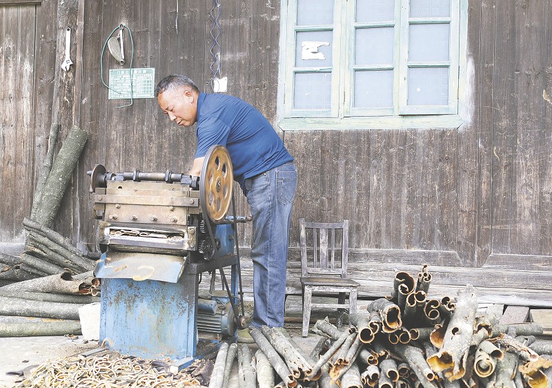 拿出砍刀,间隔几十厘米环切两圈,再用砍刀顶端的尖勾纵滑一刀,用手掰开裂缝,顺着裂缝穿过皮木间即可剥下。树皮剥下后,呈自然卷筒状,大筒套小筒,3至5筒套在一起。把树干皮剥好后,再把树砍下,剥枝干皮,最后把整根也挖出剥皮。端午节前后,植株生长旺盛,皮层细胞分裂快,是皮层与木质部最容易分离的时期。谌新华说:“剥皮工钱是一块钱一斤,多的时候一个人一天能剥600斤。”