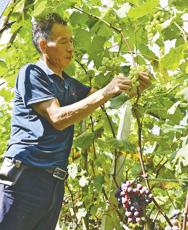 8月5日,记者在益阳高新区谢林港镇康发葡萄园,发现一株葡萄藤上挂了两批果,紫色的7月份已经成熟,绿色的要等9月底才成熟。葡萄园主人曹志明介绍,园内共有7亩多地用于实验种植两批果,亩产在原有1500公斤的基础上增加了1000公斤,而且这样种植的葡萄口感更好。所有品种中只有荔枝葡萄、午夜美人葡萄两个品种可以这样种植。技术要点是增加葡萄藤养分,及时进行修剪,确保当年葡萄藤第一季开花后,半个月后接着开第二次。